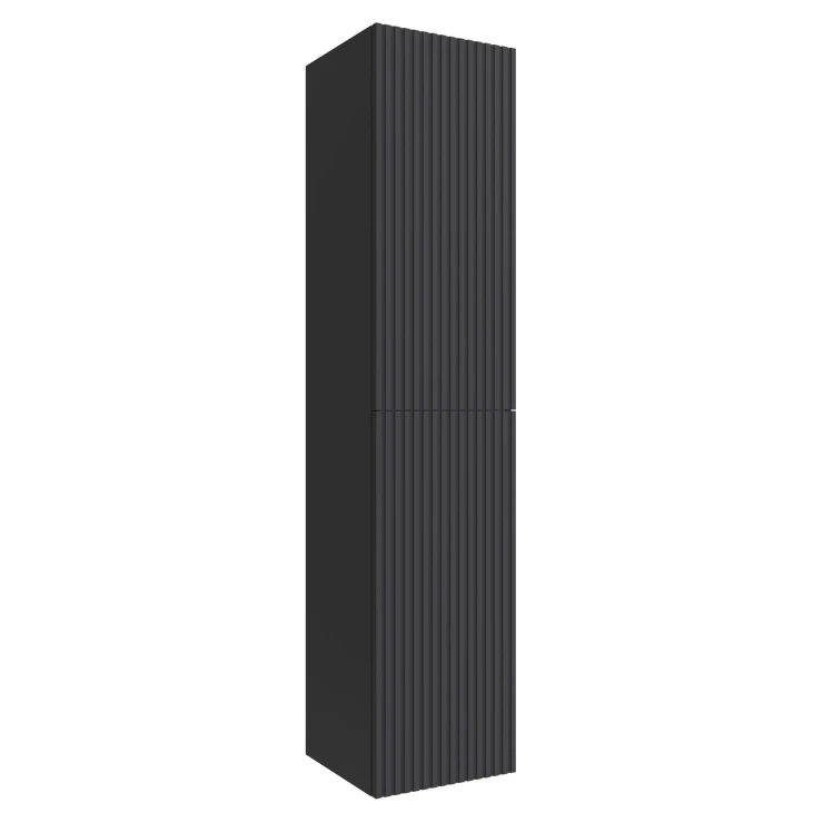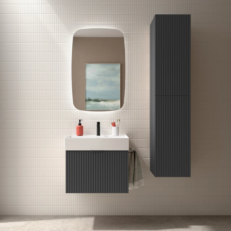 Det har samma karaktäristiska vertikalt spårfrästa fronter och färger som tvättställsskåpen, vilket skapar en harmonisk och enhetlig helhet.