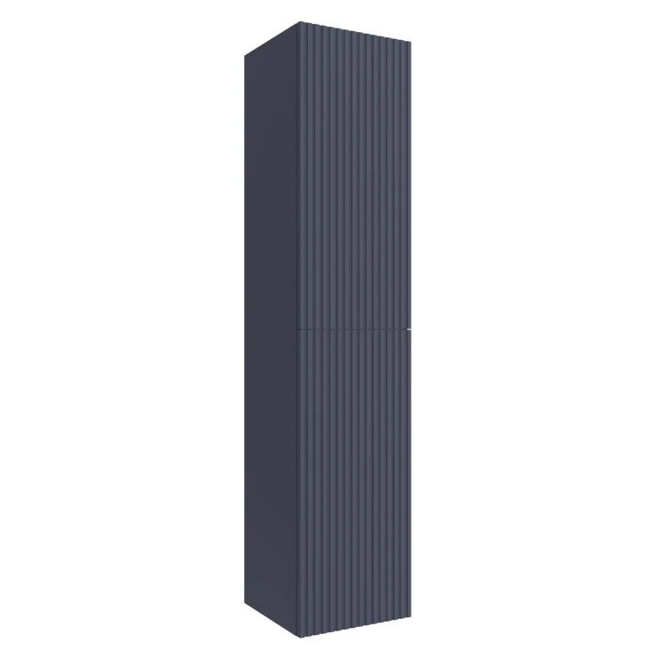 Det har samma karaktäristiska vertikalt spårfrästa fronter och färger som tvättställsskåpen, vilket skapar en harmonisk och enhetlig helhet.
