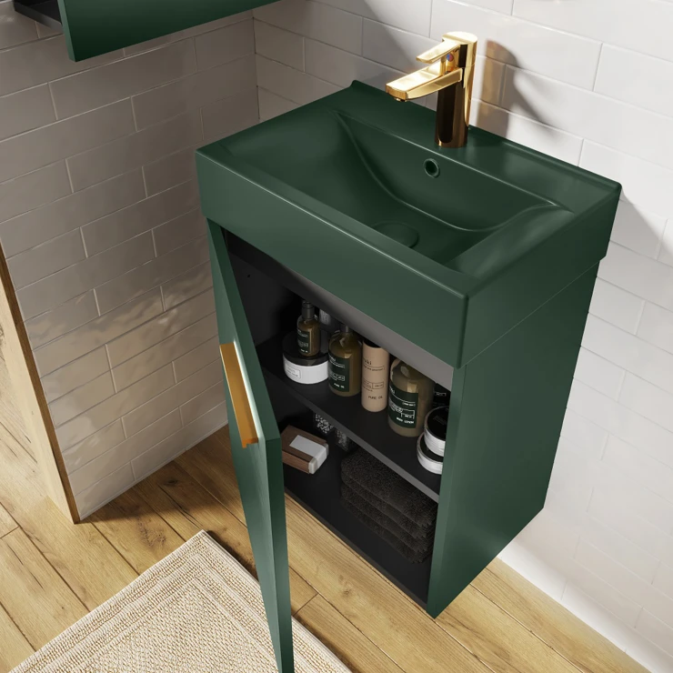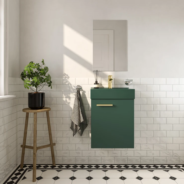 Badrumspaket Petit Grön Matt 45 cm med Handfat Grön Matt, Tvättställsblandare & Spegel