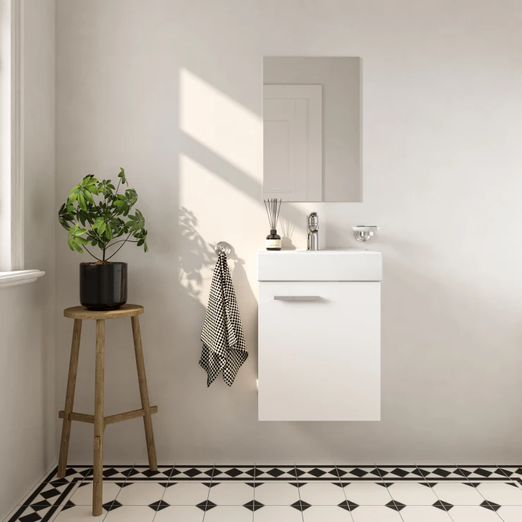 Badrumspaket Petit Vit Blank 45 cm med Handfat Vit Blank, Tvättställsblandare & Spegel