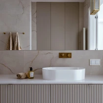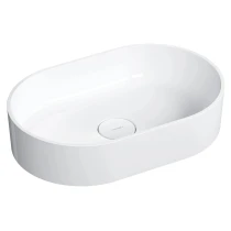 Tvättstället för bänkskiva från OMNIRES OVO-kollektionen utmärks av en uttrycksfull siluett med perfekta proportioner, inspirerad av två halvcirklar. De harmoniskt formade väggarna avslutas med en plan kant som framhäver den eleganta designen. Inuti skålen säkerställer den matchande täckbrickan en stilren och enhetlig finish.