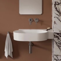 Den genomarbetade formen möjliggör flexibel montering – på vägg, i hörn eller på bänkskiva – och de kompakta måtten gör tvättstället perfekt även för mindre utrymmen.