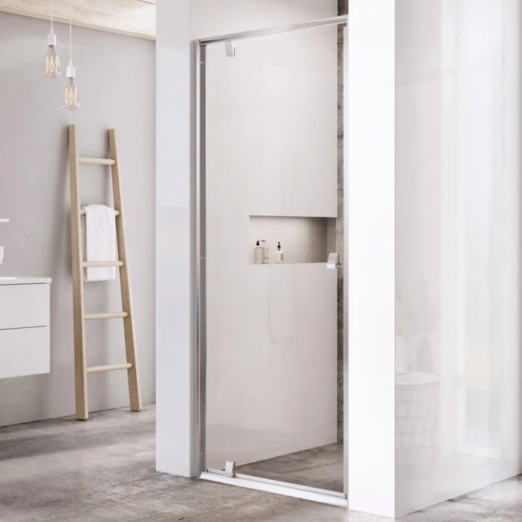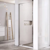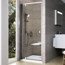 Pivot endelad duschdörr med ram i vit finish samt kromade handtag och gångjärn. Panelen är tillverkad av klart glas med skyddande Ravak AntiCalc®-behandling. Pivot-öppningssystem. Reversibel design för installation med vänster- eller högeröppning.