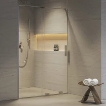 Duschdörren består av en fast glasdel och en skjutbar panel, som löper längs den nedre styrskenan med hjälp av nedre hjul. Du kan få vänster- eller högeringång genom att placera den fasta glasdelen på vänster eller höger sida och rotera den skjutbara panelen 180° vertikalt vid installationen.
