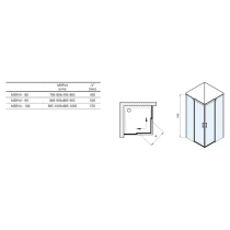 Produkten består av två plana fasta paneler och två plana rörliga paneler som bildar en skjutdörr. Produkten är avsedd för montering i ett kaklat hörn av badrummet, direkt på golvet tillsammans med en inbyggd duschkanal eller punktbrunn.