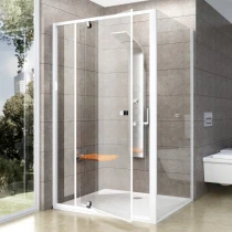 Duschhörnan består av två separata produkter: en duschdörr och en fast panel. Genom att rotera produkten 180° kan du välja dörröppning åt vänster eller höger. Produkten är avsedd för montering i ett kaklat hörn av badrummet direkt på golvet tillsammans med en inbyggd duschkanal eller punktbrunn.
