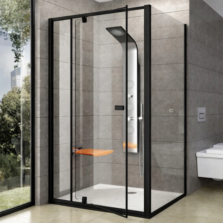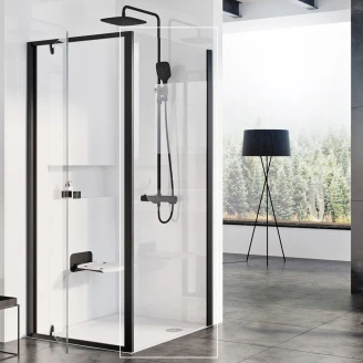 Duschhörnan består av två separata produkter: en duschdörr och en fast panel. Genom att rotera produkten 180° kan du välja dörröppning åt vänster eller höger. Produkten är avsedd för montering i ett kaklat hörn av badrummet direkt på golvet tillsammans med en inbyggd duschkanal eller punktbrunn.