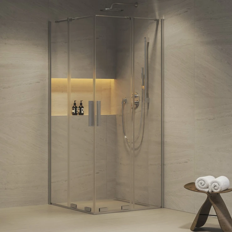 Roll fyrdelad hörndusch i blank kromfinish, med klara glaspaneler skyddade med Ravak AntiCalc®-behandling som motverkar kalkavlagringar. Skjutdörrssystem.