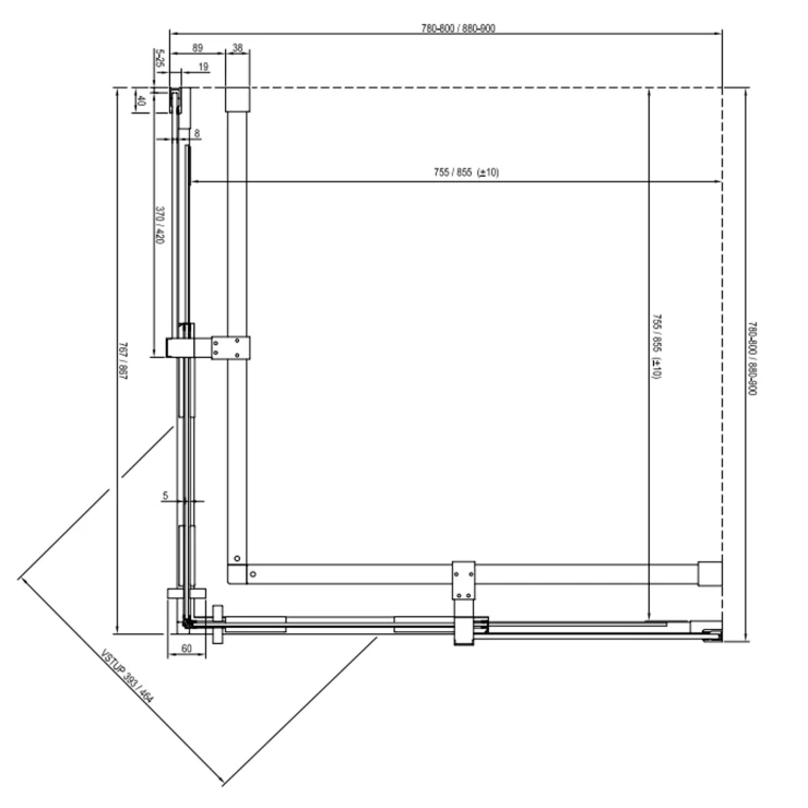 Duschhörnan består av två fasta glasdelar och två skjutbara paneler, som löper längs den nedre styrskenan med hjälp av nedre hjul.