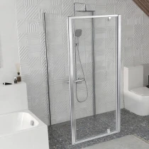 Pivot tresidig duschhörna med ram i vit finish samt kromade handtag och gångjärn. Panelerna är tillverkade av klart glas med skyddande Ravak AntiCalc®-behandling. Pivot-öppningssystem. Produkten består av en duschdörr och två fasta paneler. Reversibel design för installation med vänster- eller högeröppning.