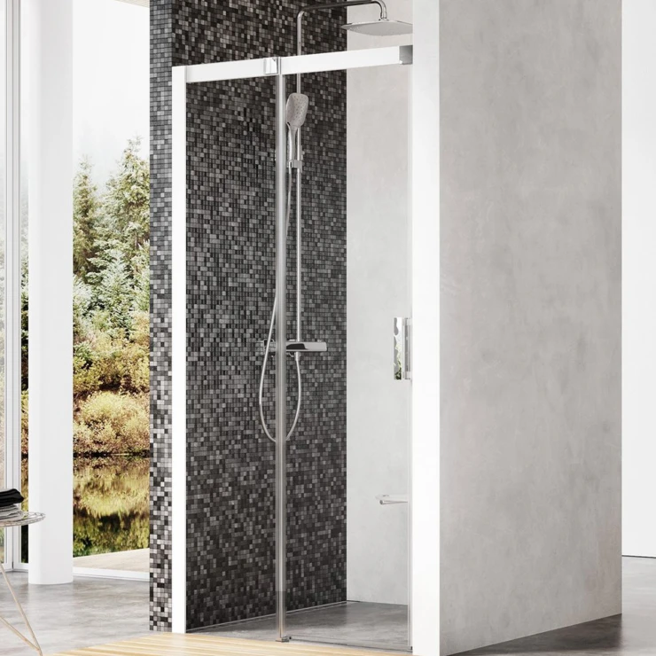 Matrix tvådelad duschdörr i vit finish med paneler av klart glas, skyddade med Ravak AntiCalc®-behandling. Skjutdörrssystem.
