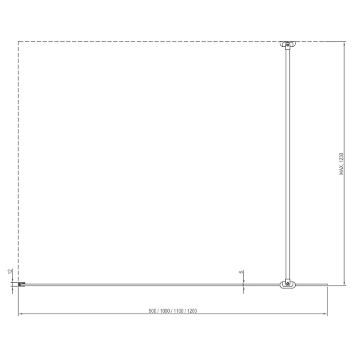 Den fasta glasväggen har en höjd på 200 cm, och stabiliteten säkerställs av en 120 cm stödstång i metall i blank krom. Stången kan kortas efter behov, så att du kan anpassa ingångsöppningen – upp till 120 cm.