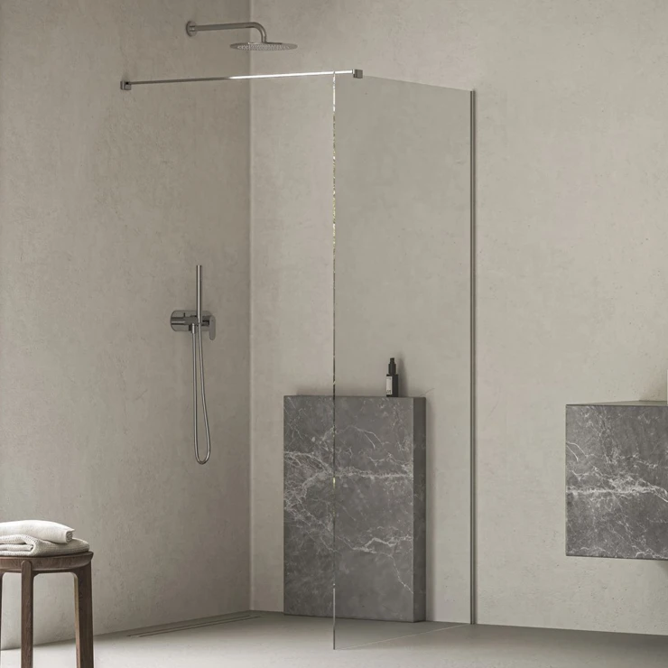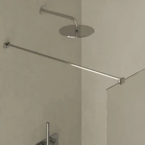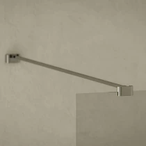 Den fasta glasväggen har en höjd på 200 cm, och stabiliteten säkerställs av en 120 cm stödstång i metall i blank krom. Stången kan kortas efter behov, så att du kan anpassa ingångsöppningen – upp till 120 cm.