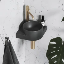 Stabilt stöd, inget möbelbehov: Yard monteras direkt på väggen med hjälp av en stålkonsol, vilket eliminerar behovet av extra möbler. Konsolen följer tvättställets form och förstärker helhetsintrycket.
