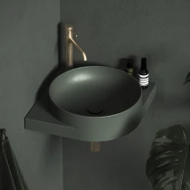 Stabilt stöd, inget möbelbehov: Yard monteras direkt på väggen med hjälp av en stålkonsol, vilket eliminerar behovet av extra möbler. Konsolen följer tvättställets form och förstärker helhetsintrycket.
