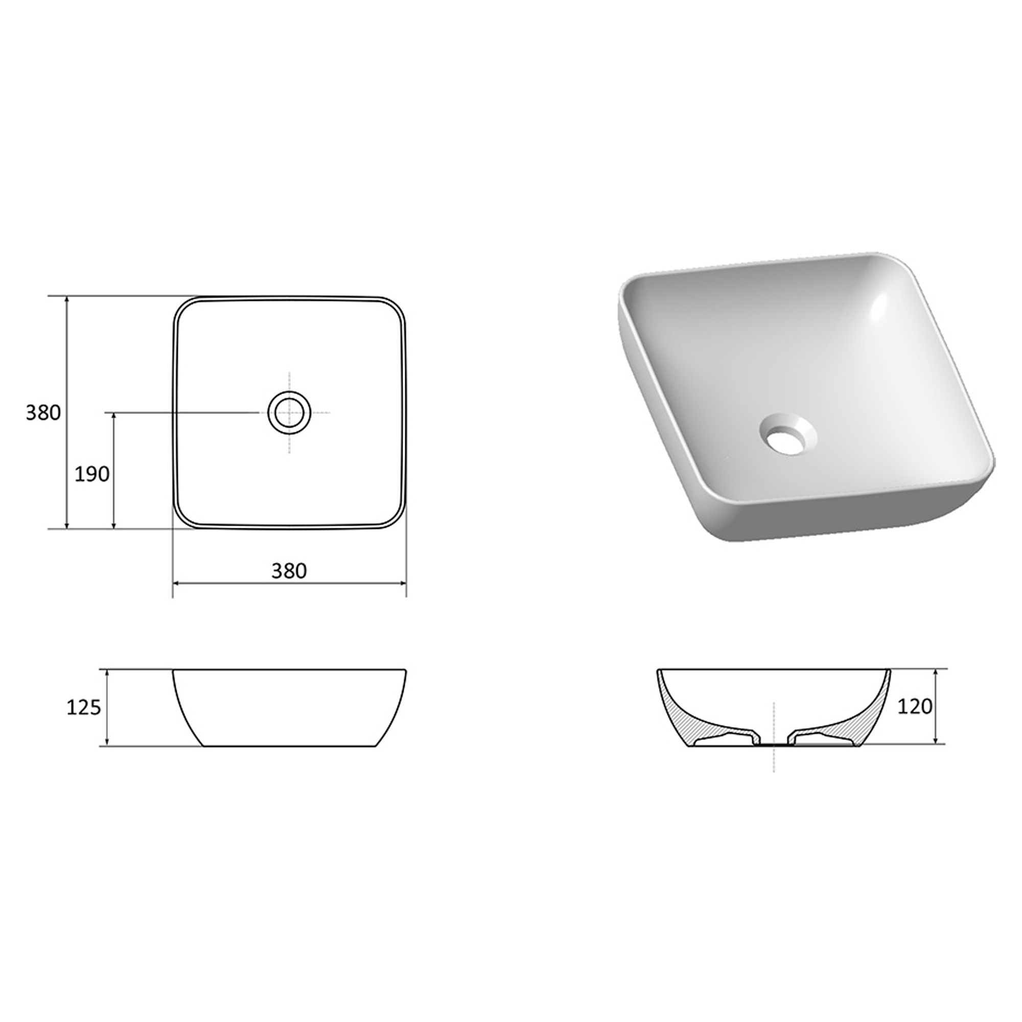- Mål: 380 × 380 × 125 mm