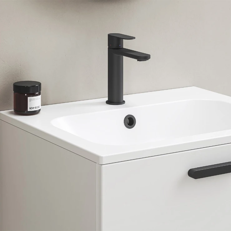 Tvättställsblandare för montering på bänk, utan lyftventil. I svart finish. I kromfinish. BeCool-funktion som sparar vattenförbrukning.