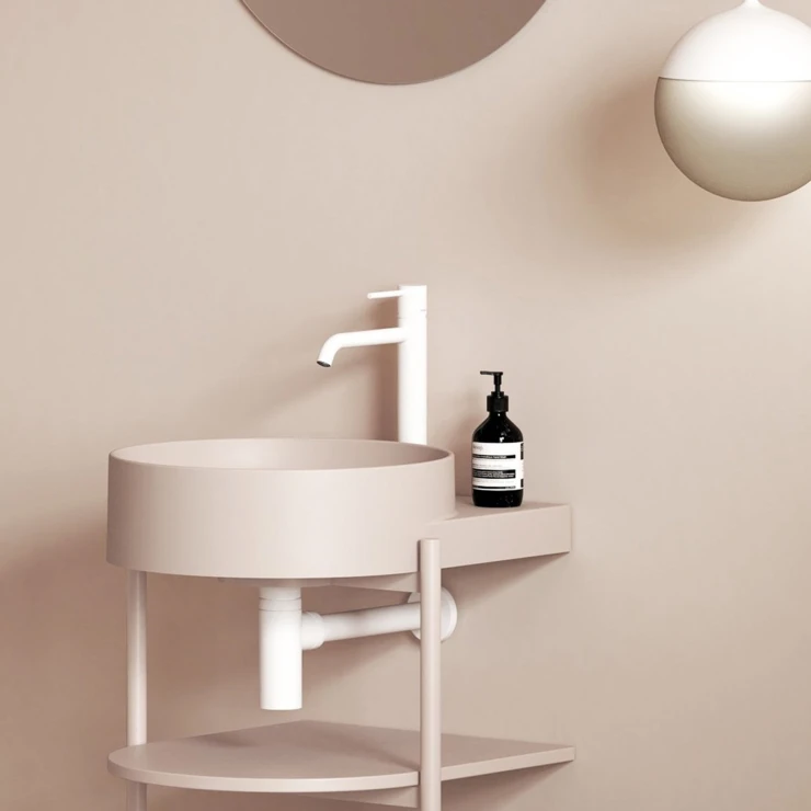 Takket være de velafbalancerede proportioner føles hyldesystemet på stålben ikke klodset og giver samtidig masser af opbevaring til badeværelsesartikler. |