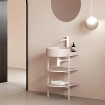 Yard tyndvægget keramisk vask, Yard fritstående metalstruktur med hylder til installation, Flat fast bundventil. Det åbne Yard-møbel består af en stabil metalramme og to hylder. Den fritstående metalstruktur med hylder CS Yard 40 er specifikt designet til Yard 40-vasken. Strukturen er udstyret med et hul til vandlåsen samt stabiliserende fødder. Hylderne følger perfekt vaskens form og tilbyder masser af opbevaringsplads. Produktet skal sikres mod væggen. Leveres usamlet. |
