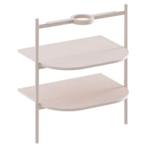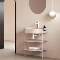 Takket være de velafbalancerede proportioner føles hyldesystemet på stålben ikke klodset og giver samtidig masser af opbevaring til badeværelsesartikler. |