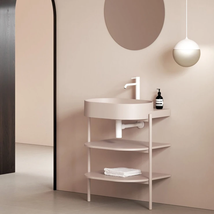 Tack vare de väl avvägda proportionerna känns hyllsystemet på stålben inte skrymmande och ger samtidigt gott om förvaring för badrumsartiklar.