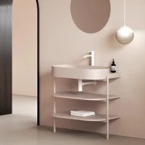 Yard tyndvægget keramisk vask, Yard fritstående metalstruktur med hylder til installation, Flat fast bundventil. Det åbne Yard-møbel består af en stabil metalramme og to hylder. Den fritstående metalstruktur med hylder CS Yard 40 er specifikt designet til Yard 40-vasken. Strukturen er udstyret med et hul til vandlåsen samt stabiliserende fødder. Hylderne følger perfekt vaskens form og tilbyder masser af opbevaringsplads. Produktet skal sikres mod væggen. Leveres usamlet. |