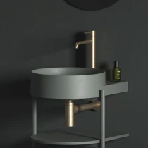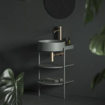 Yard tyndvægget keramisk vask, Yard fritstående metalstruktur med hylder til installation, Flat fast bundventil. Det åbne Yard-møbel består af en stabil metalramme og to hylder. Den fritstående metalstruktur med hylder CS Yard 40 er specifikt designet til Yard 40-vasken. Strukturen er udstyret med et hul til vandlåsen samt stabiliserende fødder. Hylderne følger perfekt vaskens form og tilbyder masser af opbevaringsplads. Produktet skal sikres mod væggen. Leveres usamlet. |