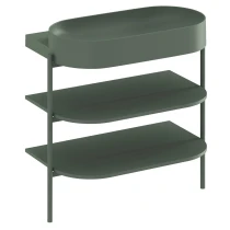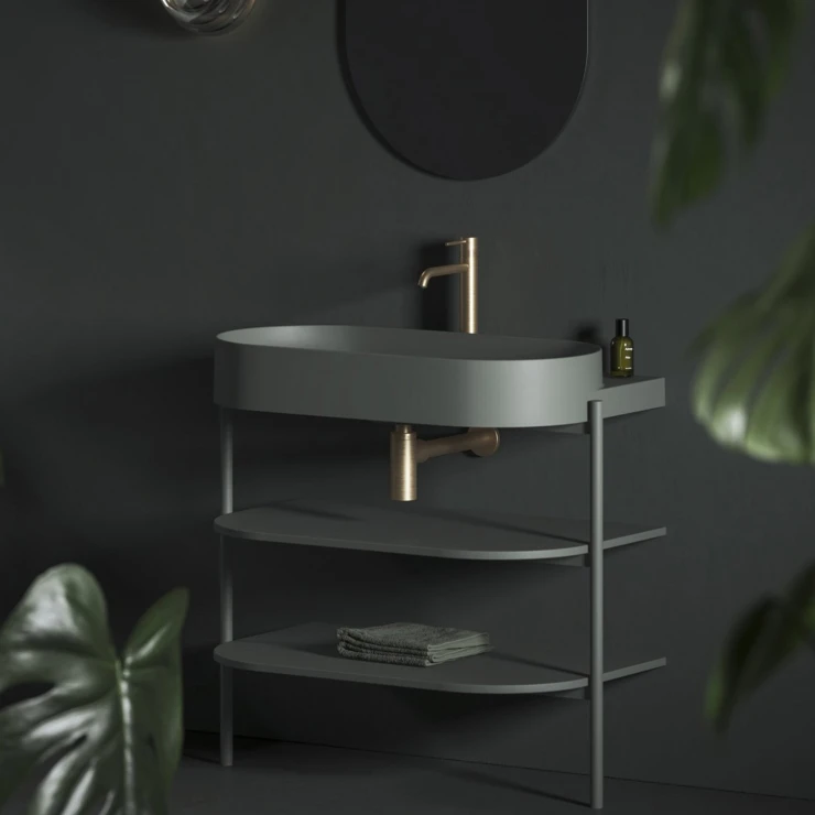 Takket være de velafbalancerede proportioner føles hyldesystemet på stålben ikke klodset og giver samtidig masser af opbevaring til badeværelsesartikler. |