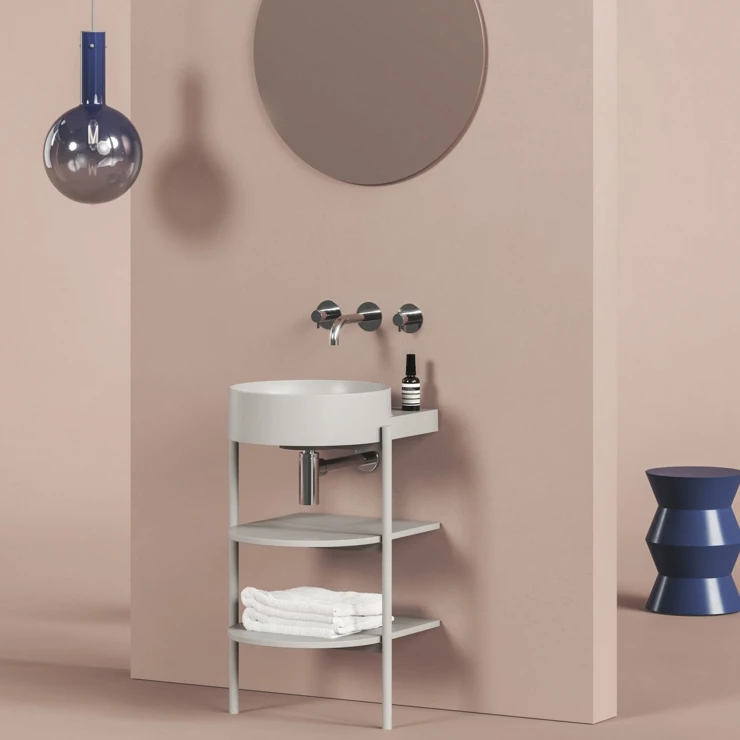 Tack vare de väl avvägda proportionerna känns hyllsystemet på stålben inte skrymmande och ger samtidigt gott om förvaring för badrumsartiklar.
