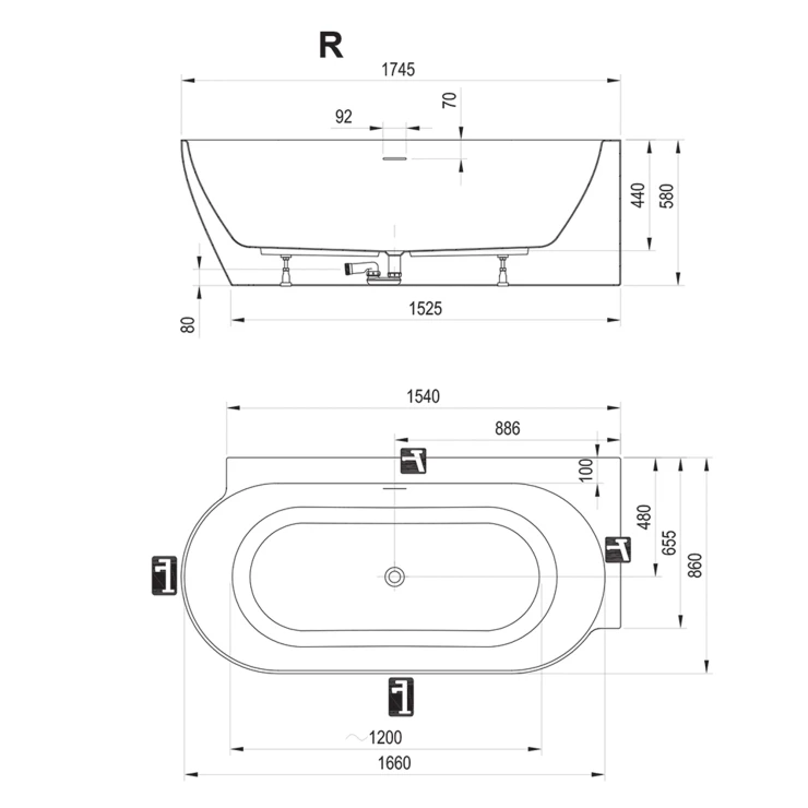 Badekarret er ikke kompatibelt med en badekarsvæg. Afløbssættet (dvs. overløb, bundventil, vandlås, lugtstop) og støtteben er inkluderet i pakken.