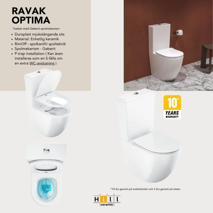 Optima RimOff monoblockstoalett erbjuder dig en ren och hygienisk yta. Skålen utan spolkant har inga ställen där smuts kan samlas. Tack vare den raffinerade inre formen garanteras en perfekt spolning. Det är en idealisk lösning för dem som värdesätter perfekt renlighet, hygien och enkel skötsel. Toaletten är utformad för att ge dig maximal komfort och sinnesro, med vetskapen om att den alltid är perfekt ren.