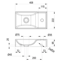 Detta tvättställ har kompakta mått (ca 40,8 × 22,2 cm) och är utformat för väggmontering. Eftersom modellen saknar bräddavlopp, krävs en fast bottenventil tillsammans med en blandare för däckmontering.