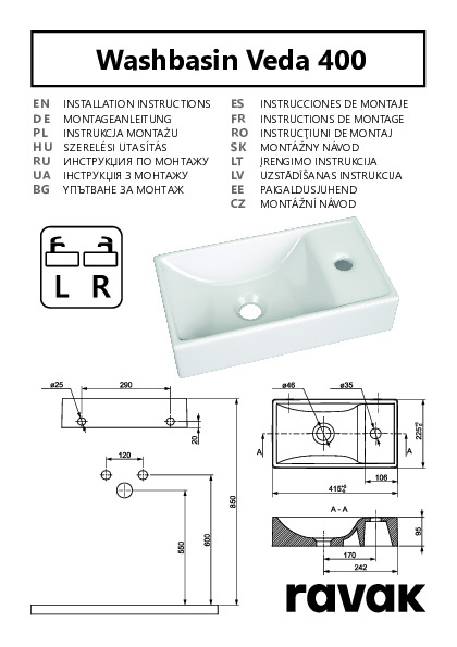 Tvättstället har ett 35 mm hål för blandare och levereras med komplett monteringssats för väggmontage.