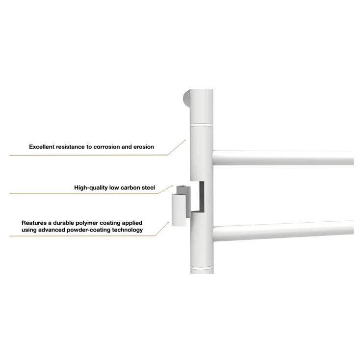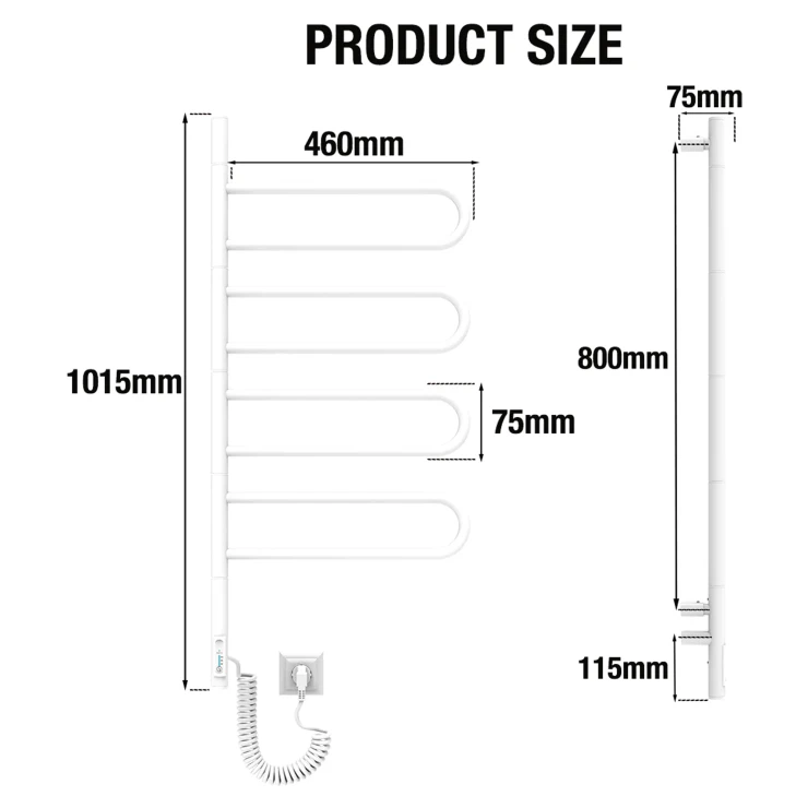 Denne elektriske håndklædetørrer er designet til høj komfort og nem anvendelse. Den kan tilsluttes hvor som helst, der er adgang til strøm. Takket være et tørt internt varmesystem kræves ingen væsker – det er bare at tilslutte og begynde at bruge. Håndklædetørreren varmes hurtigt op og når sin maksimale temperatur inden for få minutter.