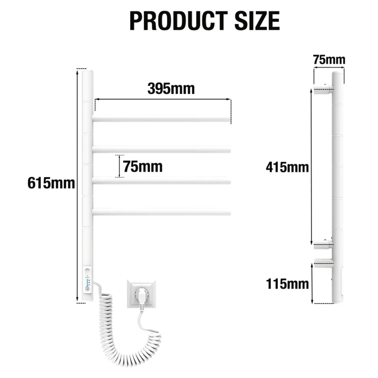 Denne elektriske håndklædetørrer er designet til høj komfort og nem anvendelse. Den kan tilsluttes hvor som helst, der er adgang til strøm. Takket være et tørt internt varmesystem kræves ingen væsker – det er bare at tilslutte og begynde at bruge. Håndklædetørreren varmes hurtigt op og når sin maksimale temperatur inden for få minutter.