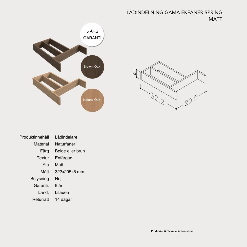 Upptäck vår eleganta kollektion av lådinelningar Gama i ekfaner, inklusive modellerna Spring, Autumn och Smoked Oak. Dessa praktiska lådindelningar kombinerar stil och funktionalitet, vilket gör det enkelt att organisera dina utrymmen på ett effektivt sätt. Med en modern och tidlös design passar de perfekt i alla hem, oavsett inredningsstil. Välj Gama-lådindelning för att maximera utrymmet och skapa en ordnad och harmonisk miljö!