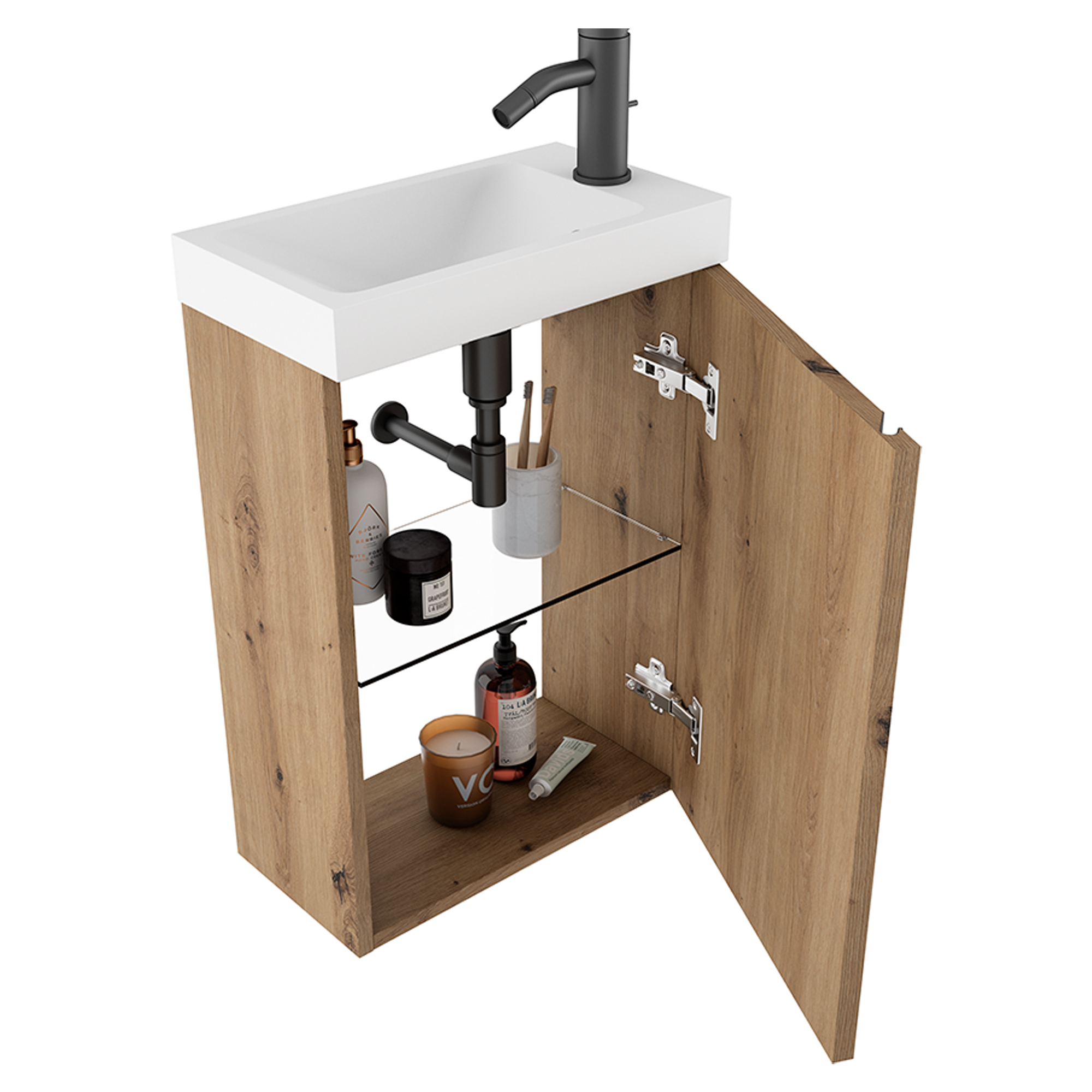 - Badeværelsesskabet har en matlakeret laminatoverflade og et soft-close dørsystem.