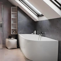 Detta fristående väggnära hörnbadkar är en lösning för dig som vill kombinera den monolitiska elegansen hos ett fristående badkar med praktisk funktionalitet i ett smart planerat badrum. Konstruktionen gör det möjligt att använda både väggmonterad och kantsmonterad badkarsblandare, eftersom det finns möjlighet att borra hål i badkarskanten. Produkten är dessutom utrustad med en bekväm avlastningshylla intill väggen – perfekt för badtillbehör och hygienartiklar.