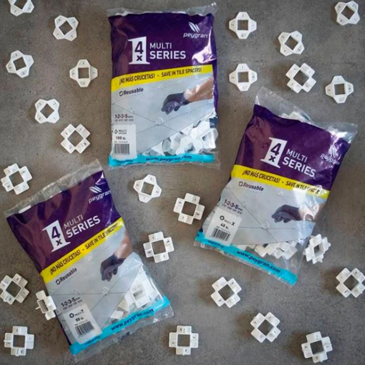 Multi-Serie ( I ) flisekryds er fire flisekryds i ét. Dvs. at et flisekryds har 4 sider med 1,2,3, henholdsvis 5 mm afstand/fugebredde, disse flisekryds kan genbruges igen og igen. Flisekrydsene er ekstra holdbare, så de passer godt til store og tunge fliser. Fremstillet i genbrugsmateriale. Disse ( I ) flisekryds er beregnet til at sætte mellem to flisers lange eller korte side.
