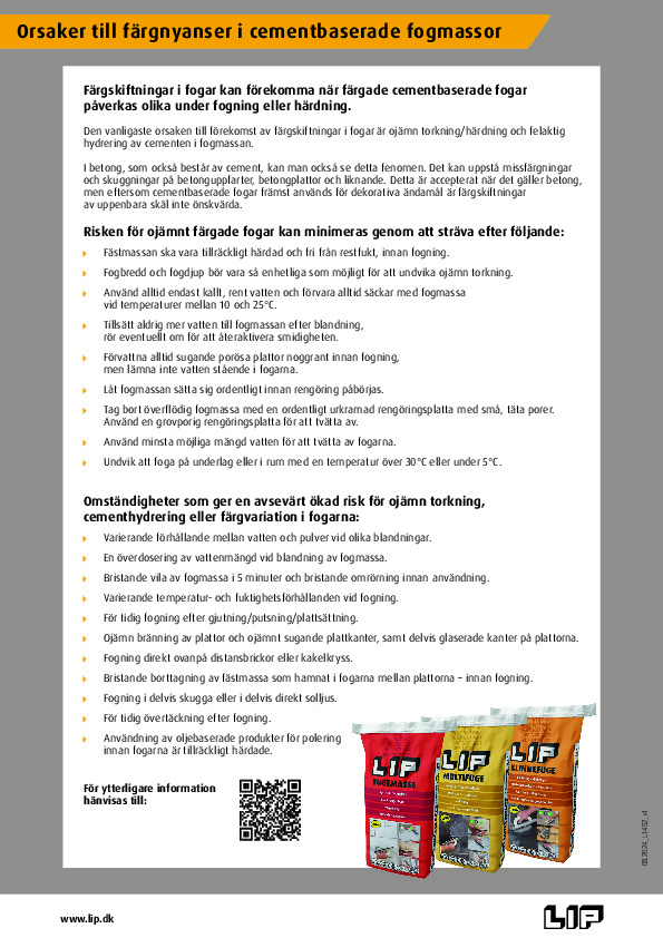 LIP Fugemasse er særlig egnet til fugning af sugende og porøse fliser. LIP Fugemasse er frostsikker og kan anvendes både inden- og udendørs.