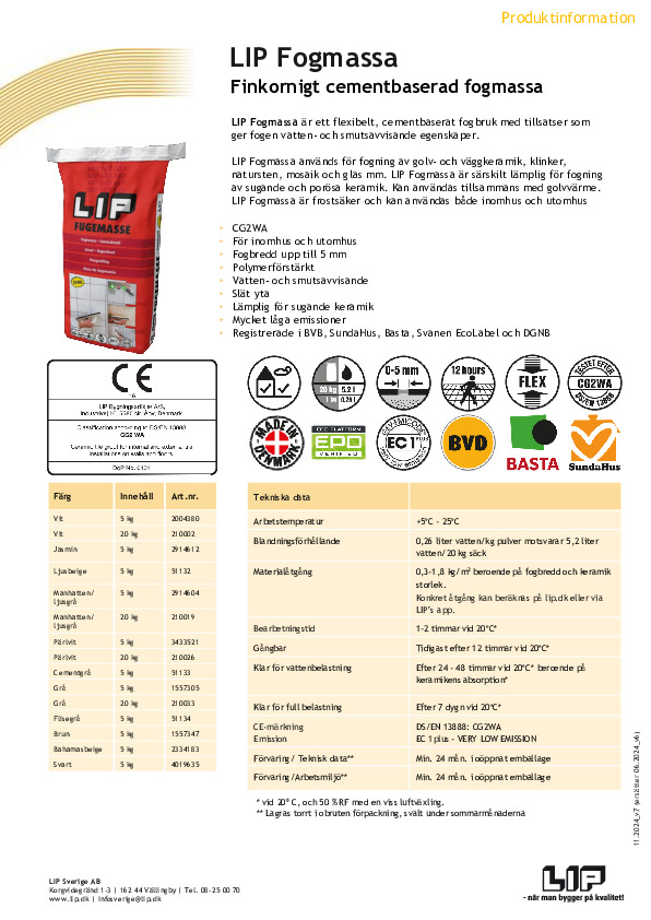 LIP Fugemasse er en fleksibel, polymerforstærket, cementbaseret fugemørtel med vand og smudsafvisende egenskaber. LIP Fugemasse anvendes til fugning af keramiske gulv- og vægfliser, klinker, natursten, mosaik og glasfliser m.m.