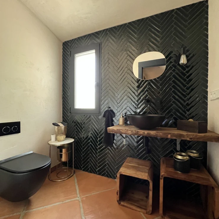Vänligen notera: Även om plattorna är lämpliga för badrum, rekommenderas de inte för installation i duschutrymmen. Kontinuerlig exponering för vatten, schampo och tvål kan skada ytan och orsaka permanenta fläckar på grund av materialets höga porositet.