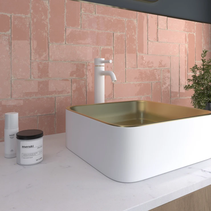Kollektionen fås i 6,9×24 cm vægfliser af hvidt lergods med blank krystallinglasur, samt 20×20 cm porcelænsfliser til både væg og gulv. Formatet 6,9×24 cm fremhæver dybe, livlige farver og slidte kanter, hvor den matte base træder frem under den blanke glasur, mens 20×20 cm-fliserne fås som ensfarvede og dekorative mønstrede fliser med R10/Class 2 skridsikkerhed, velegnede til både indendørs og udendørs brug.