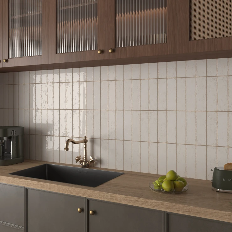 Kollektionen fås i 6,9×24 cm vægfliser af hvidt lergods med blank krystallinglasur, samt 20×20 cm porcelænsfliser til både væg og gulv. Formatet 6,9×24 cm fremhæver dybe, livlige farver og slidte kanter, hvor den matte base træder frem under den blanke glasur, mens 20×20 cm-fliserne fås som ensfarvede og dekorative mønstrede fliser med R10/Class 2 skridsikkerhed, velegnede til både indendørs og udendørs brug.