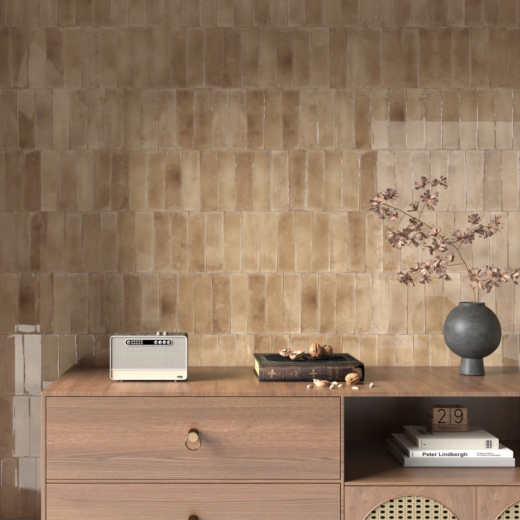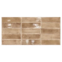 - 6,9×24 cm vægfliser med intens blank glans og let slidte kanter, der tilfører dybde og håndlavet karakter;