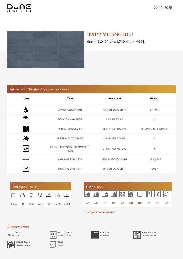 Dune Kakel Milano Blu Matt 7x24 cm från serie Milano Dune. Milano Dune(KLD1236) Kakel 6x25 cm kan endast användas till vägg. Karaktären för Milano Dune är matt blå yta med en rund kant samt med enfärgad textur. Det nominella måttet och annan specifikation på denna platta ni kan hitta i tabell beskrivning. Denna platta har en enfärgad textur. Sök efter kollektions namnet (Milano Dune) för att se om det ingår i en serie som kanske erbjuder fler storlekar, kan även finnas andra färger.