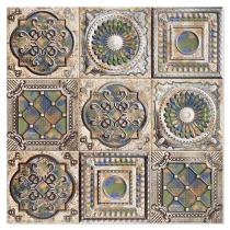 Denna platta har en texturerad yta med en synlig relief och en dekorativ patina, vilket ger mönstret djup och en handgjord, åldrad karaktär.