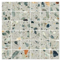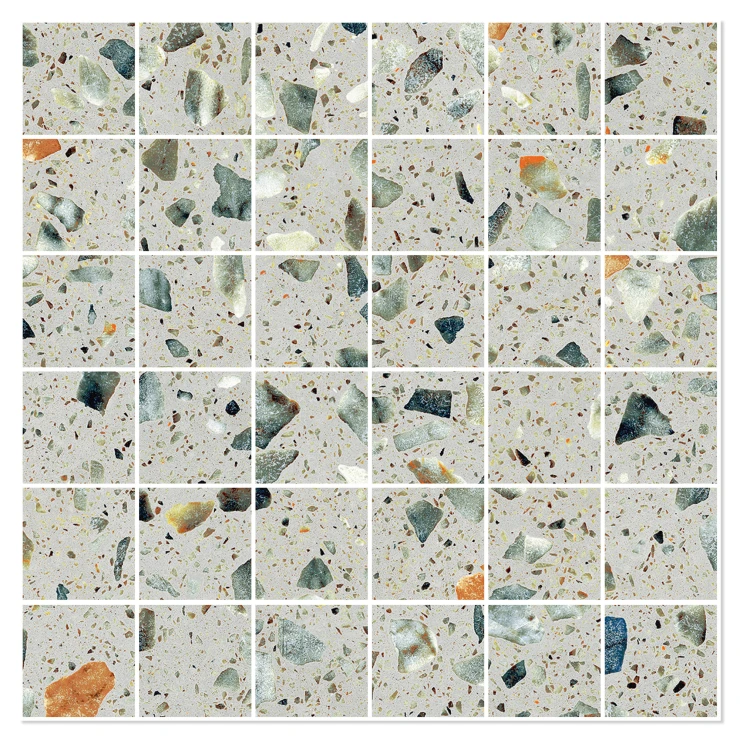 Matchende mosaikker og dekorflisen Glow Concrete tilfører yderligere designmuligheder. Den betoninspirerede overflade med sin diskrete struktur skaber en elegant kontrast til terrazzoeffekten og udvider kollektionens kreative potentiale.