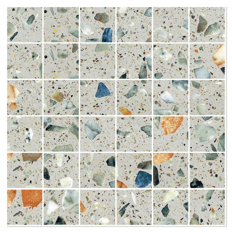 Matchende mosaikker og dekorflisen Glow Concrete tilfører yderligere designmuligheder. Den betoninspirerede overflade med sin diskrete struktur skaber en elegant kontrast til terrazzoeffekten og udvider kollektionens kreative potentiale.