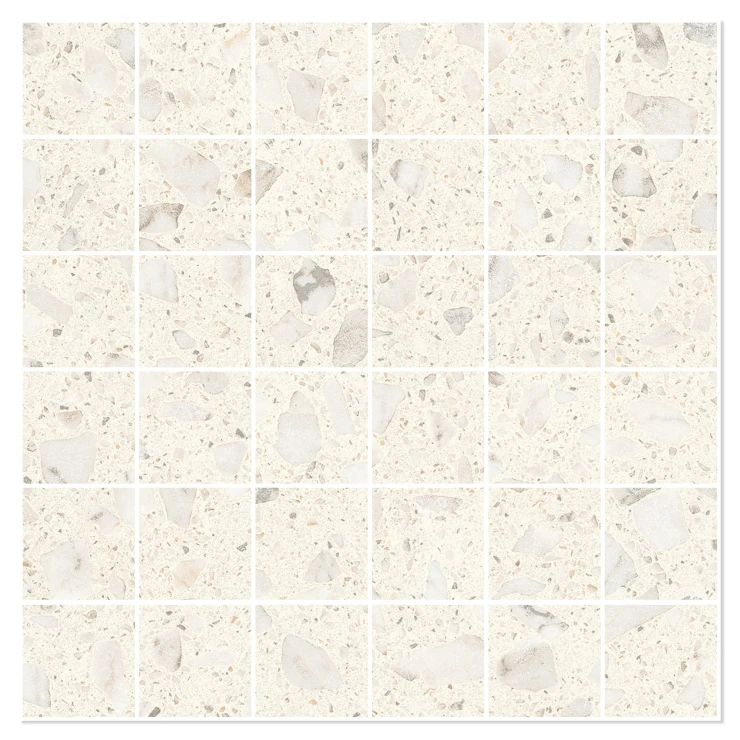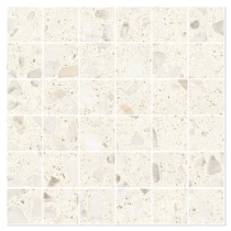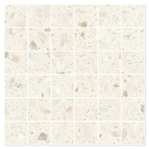 Matchende mosaikker og dekorflisen Glow Concrete tilfører yderligere designmuligheder. Den betoninspirerede overflade med sin diskrete struktur skaber en elegant kontrast til terrazzoeffekten og udvider kollektionens kreative potentiale.